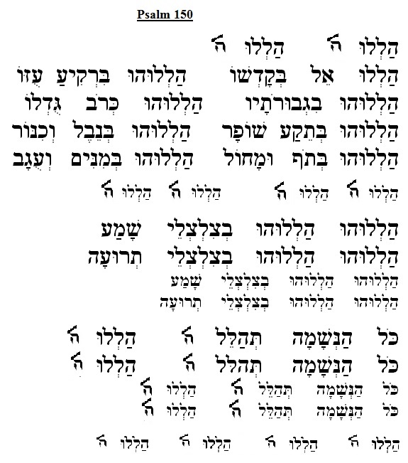 As a child, I learned a traditional “folksy” melody for Psalm 150 — one that had a nice “lilt” and rousing, but subdued ending. But it was never rousing enough for me. I was inspired by the imagery the Psalmist for praising G-d’s “abundant greatness” — calling on every available instrument — trumpets, harps, timbrels, pipes, cymbals, etc. — and concluding that: “every breath praises G-d.” For me, Psalm 150 — being the final expression of joy and awe in the face of G-d’s greatness — needed a rousing, boisterous ending — one where the singers use “every breath.”