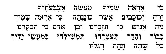 | When I see your heavens above All that you created by your touch The Moon, and stars, and planets Are where they’re supposed to be Moving through the heavens above And who are we? Do we merit your attention? Will our legacy on earth be worth a mention? Although we are not angels, You’ve honored us, by trusting us, Placing all your handiwork at our feet. |
